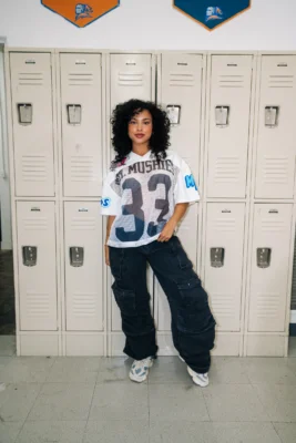 Mr. Mushies Game Day Jersey White. Cop the Game Day Jersey for the the perfect blend of street and sportswear. Featuring a lightweight, mesh design and a trendy cropped fit, this jersey is the perfect way to elevate your look. Don’t miss out on this must-have piece